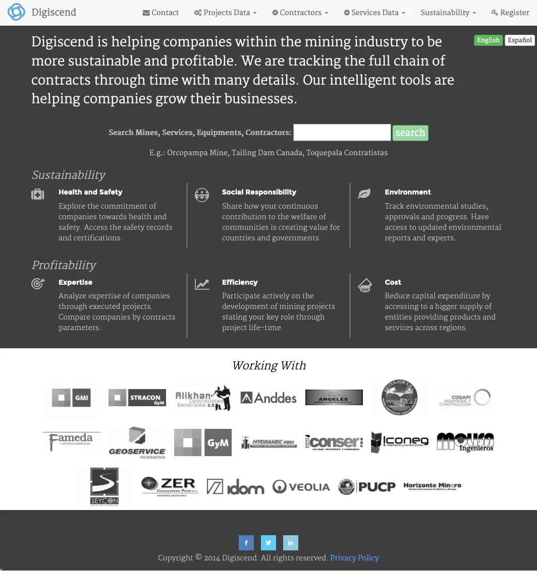 In Digiscend we were creating products for construction and engineering contractors working for Mining and Energy companies in Peru. We collect data of projects done by contractors and organize it making it usable and searchable. Thereafter creating our commercial products. I started this venture with a partner in Peru. I am the only programmer doing all development on this platform. Primary development is based on PHP/Mysql. Uses Wordpress for many tools used on the website. We also did OCR of massive government data sets using tesseract-ocr, Perl and bash script. We are using linear regression algorithm for machine learning cost estimation. Content work is handled from India and Peru. Data is also collected from customers in Peru and India.